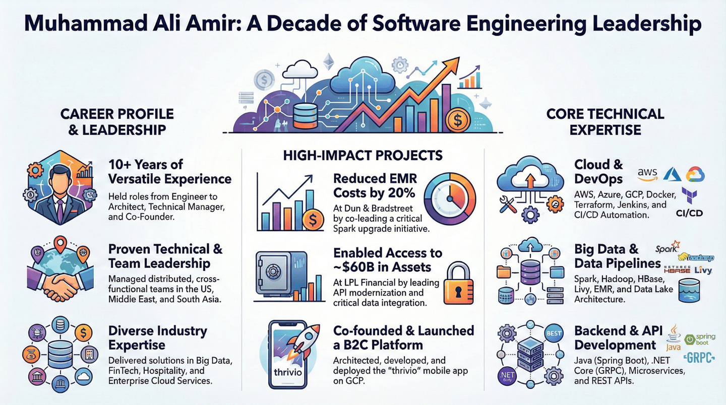 Accomplished and versatile professional with over a decade of experience in Software Engineering Leadership, blending hands-on expertise with strategic vision. Demonstrated success across all phases of the SDLC, showcasing a passion for learning, adaptability, and a results-driven mindset. With Professional Degrees: MS in Software Project Management(SPM), Bachelor's in Computer & Information Systems Engineering and several diverse roles including Software Engineer, Architect, Technical Project Lead, and Engineering Manager, led distributed teams across multiple regions and agile environments. Renowned for delivering user-centric and high-quality solutions that are pragmatic, value-oriented, and aligned with organizational objectives. 20+ Years of Global Expertise in Application Architecture, Development, and Leadership across multifarious Tech. Stack. Adaptable, dynamic and seasoned professional with diverse experience across North America, Middle East, and South Asia, delivering excellence in analyzing, architecting, developing, and managing applications across varied domains(Hospitality, Finance & Payment, Public Administration, Regulatory & Compliance, Technology, Business Information & Analytics, IT Services & Consultancy). Proven track record in offshore, on-site, and distributed models (spanning several time zones) for both project and product-based development in private and public sectors. Proficient across Java (Full-Stack), .NET (ASP.NET, GRPC Services, REST APIs), MEAN stack, and mobile development (Android, iOS), with hands-on experience on Cloud(AWS, Azure, GCP & Digital Ocean) and Big-Data technologies(Hadoop, Livy & Spark), showcasing versatility & adaptability in evolving technology landscapes.