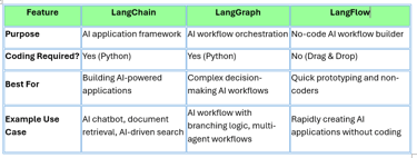 LangChain, LangGraph, and LangFlow each serve different purposes in the AI development space. Whether you’re a developer building an AI application, an engineer designing complex workflows, or a business owner looking for a no-code AI builder, these tools offer the flexibility and scalability needed for AI-driven solutions.