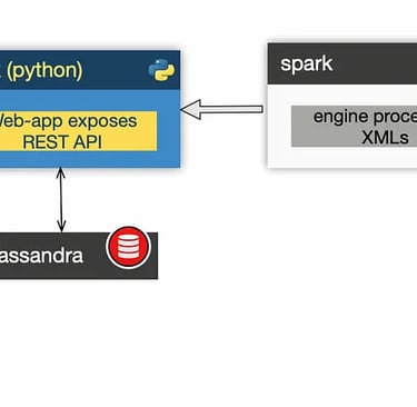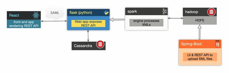 A Polyglot architecture comprising: Hadoop HDFS, a storage for XML files (uploaded either by a REST API or UI through Spring-Boot based web-app) to be processed by Spark (in-memory data processing engine) which then calls REST API (exposed by flask, a python based micro web framework web-app) to push processed information into Cassandra (NOSQL database); same flask web-app exposes GET end-point to fetch the processed information from the same Cassandra instance to be rendered by react.js front-end app.